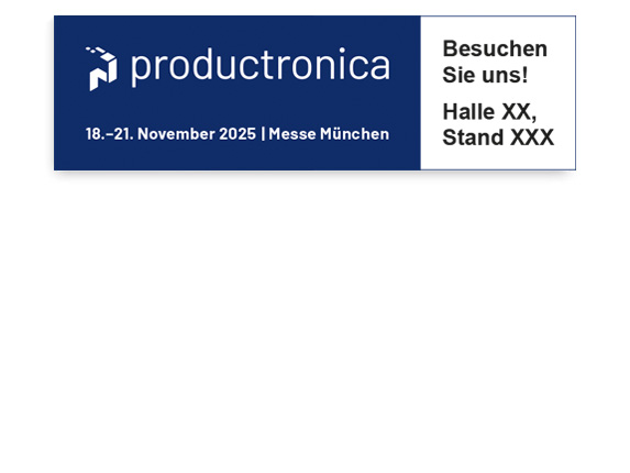 Die Banner im productronica-Design können Sie im Aussteller-Shop unter productronica.com/ausstellershop herunterladen. Die Banner stehen Ihnen in verschiedenen Größen als PNG-Datei zur Verfügung.